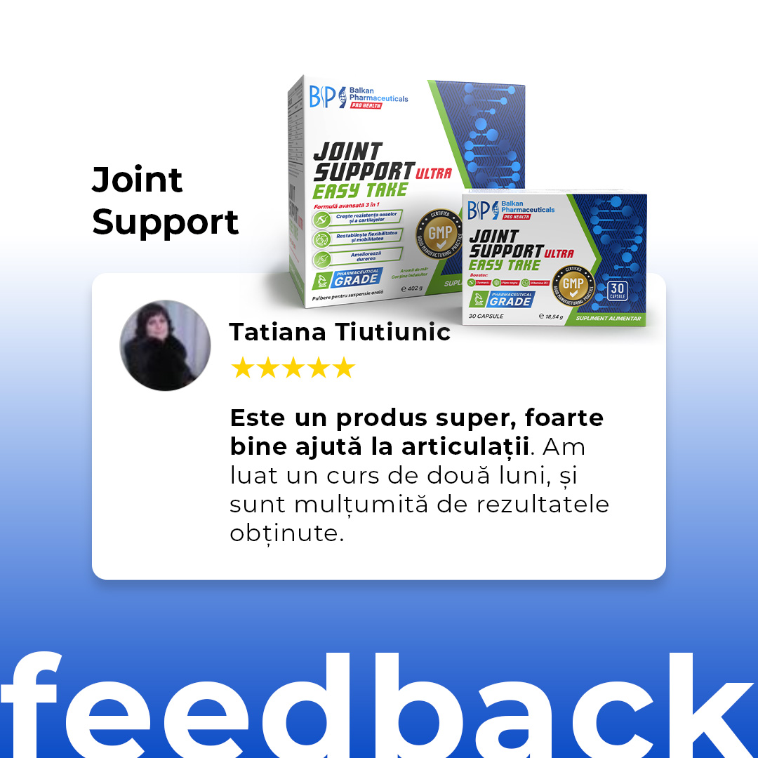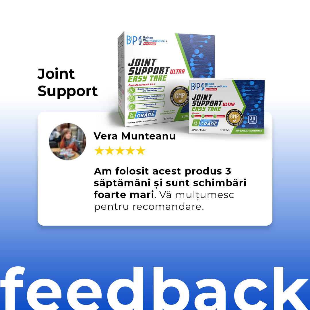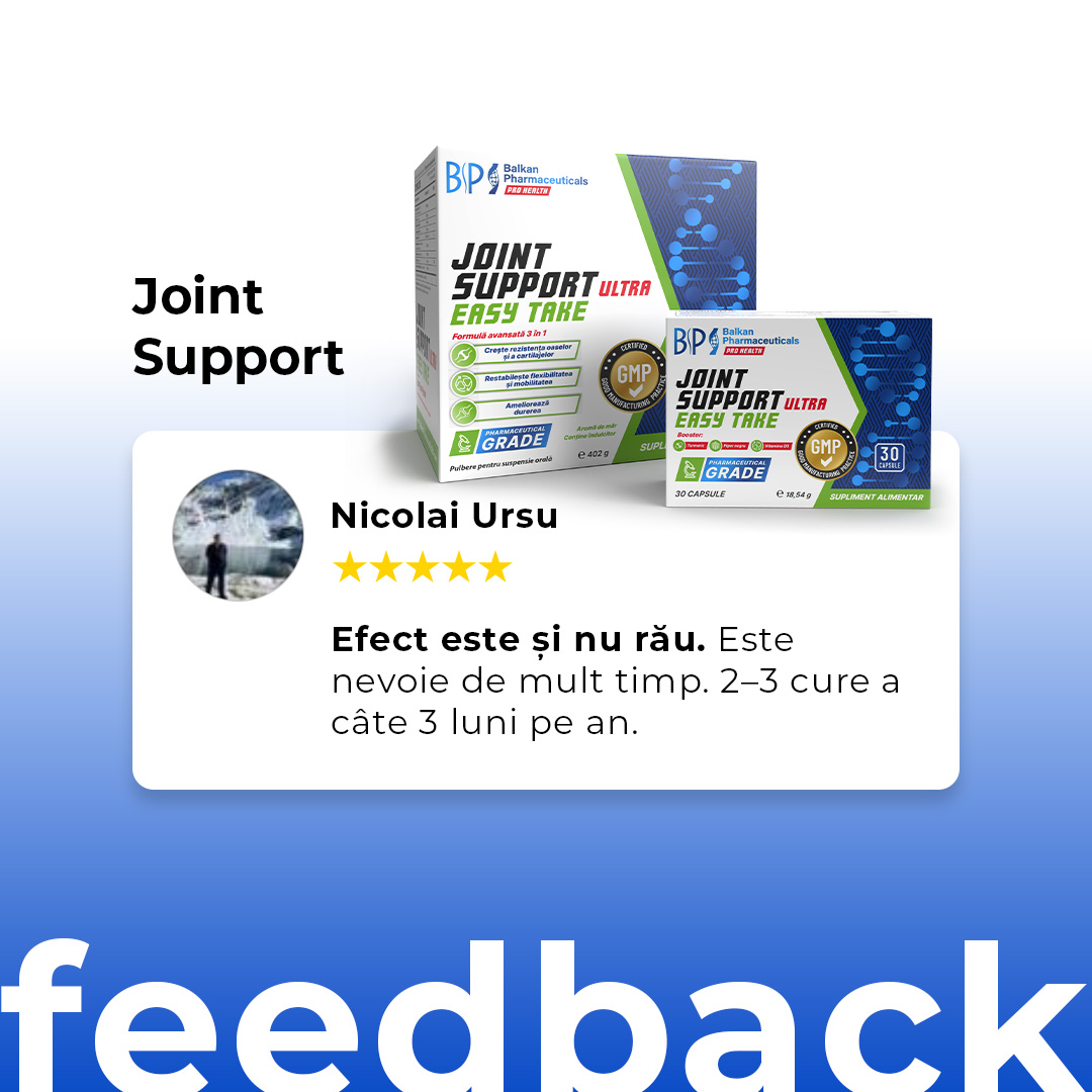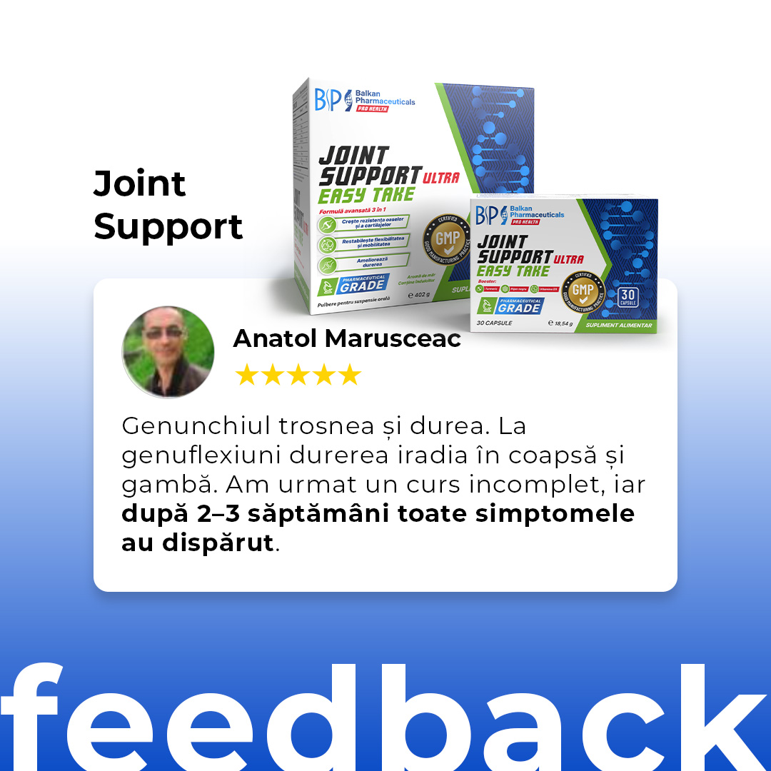 Suplimentul pentru articulații Balkan Pharmaceuticals oferă oamenilor activi o doză mare de 3000 mg de MSM, 300 mg de curcumină și 200 mg de boswellia, care, potrivit mai multor cercetări au un efect antiinflamator, reduc stresul oxidativ în organism și restabilesc flexibilitatea.